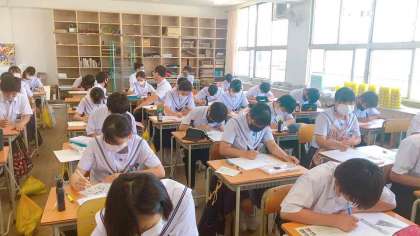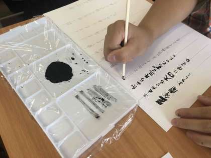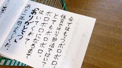 今はモチーフである体育館シューズの気持ちを想像しながら詩をつくり、手作りの割り箸ペンと墨で清書をしているところです。