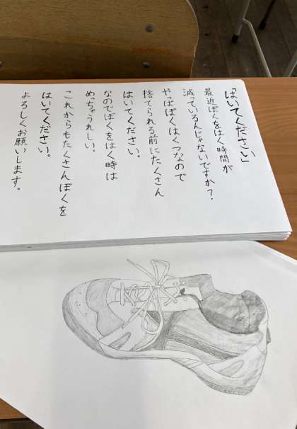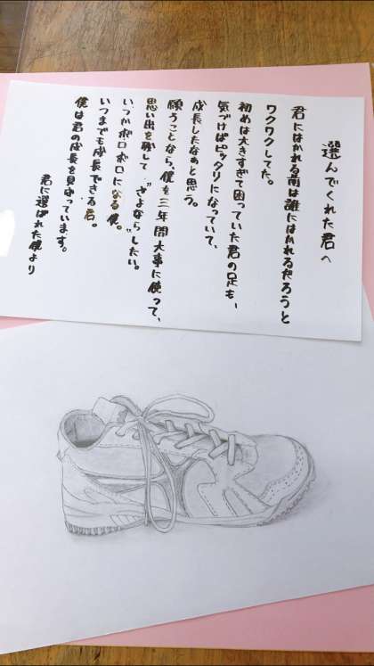 体育館シューズの気持ちを想像して割りばしペンで描いた詩と、鉛筆デッサンの作品です。