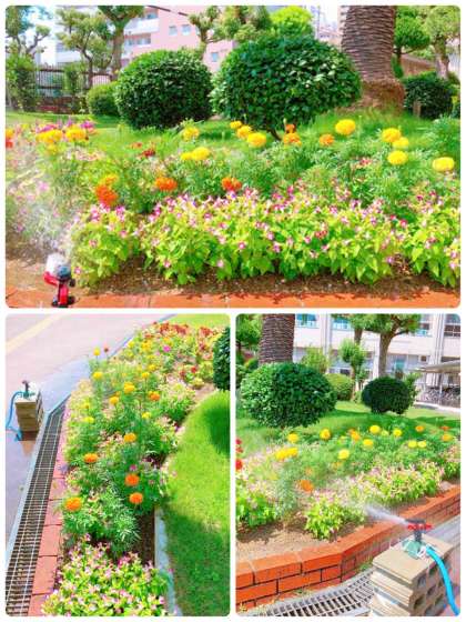 今年は、管理作業員さんが花壇に自動散水機を設置してくださいました。