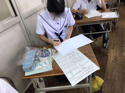 写真では、生徒が各自で考えたストーリーと絵の下書きをもとに、実際に絵本に書き込んでいるところです。