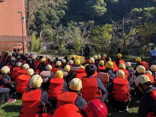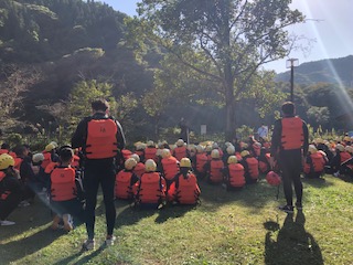 ラフティングの注意事項についてインストラクターさんより説明を受けています。
