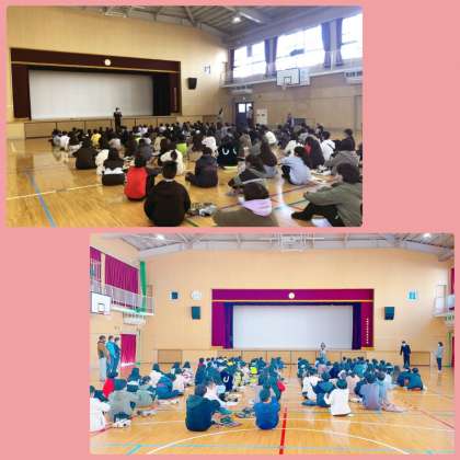 授業体験後、もう一度体育館に集まり、授業の振り返りと校長先生からのお話がありました。