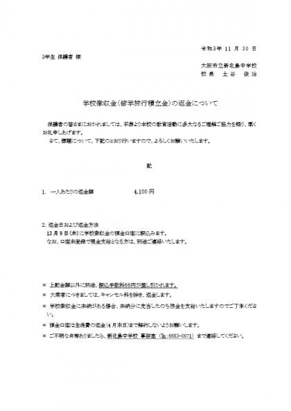 3年修学旅行積立金の返金について