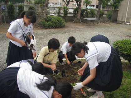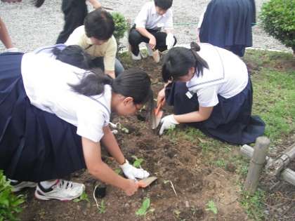 緑化委員会はひまわりの苗を正門内の花壇に植えました。