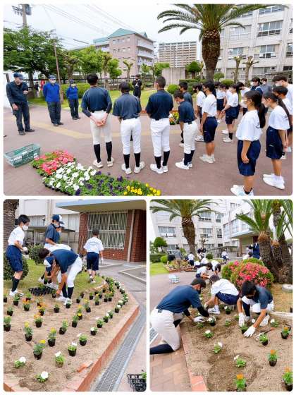 ?中間テスト終了後、緑化委員が集合し「ふれあい緑化」を行いました。