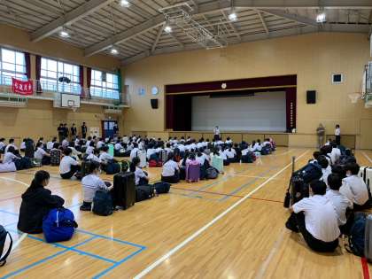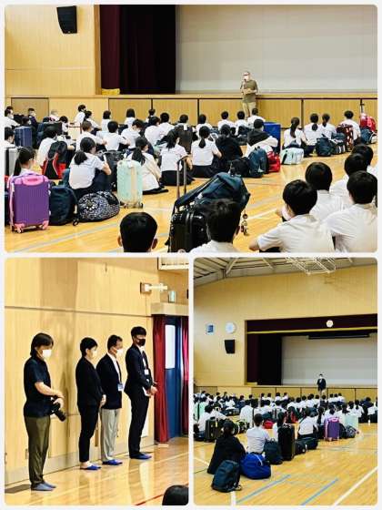 小雨降りしきる中、47期生の修学旅行がスタートしました。ここまで、2年生の三学期からおよそ3ヵ月間をかけて、生徒有志によるプロジェクトチームを中心に企画を行なってきました。今回、プロジェクトチームが考えた修学旅行のテーマは「持ち物は47期生の集大成 お土産は47期生の絆と友情」です。出発式ではそのテーマを踏まえて、プロジェクトリーダーが力強く挨拶をしてくれました。みなさん、テーマに沿った行動を通し、ひとまわり成長した姿をお土産に帰って来たいと思います。また、足元の悪い中、早朝にも関わらずお見送りに来てくださった保護者のみなさま、他学年の先生方、どうもありがとうございました。今回の修学旅行の様子は、こちらのホームページで随時お知らせいたします。お時間ありましたらどうぞご覧ください。