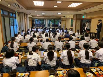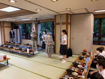 平和学習を終え、一行は平和公園を歩きながらホテルに向かいました。入館式の後、夕感染症対策を講じながらの夕食です。制限はあるものの、大勢での食事は気分が高まるものですね。