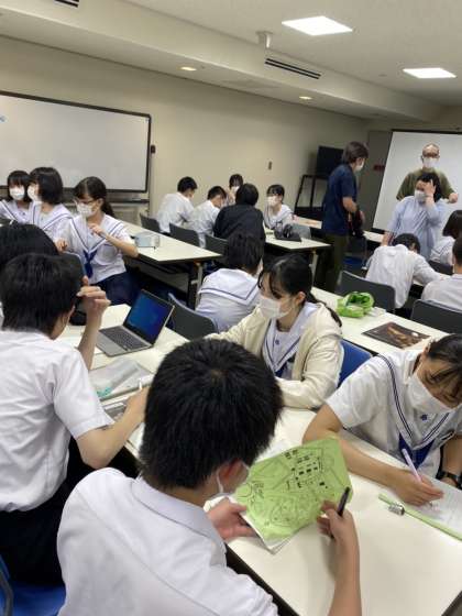 夕食を終え、ホテルのほど近くにある体育館の会議室へ移動し、今日の平和学習を振り返るワークショップを行いました。修学旅行プロジェクトチームが事前に考えたテーマについて、班で意見交流をしました。