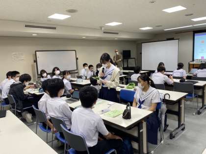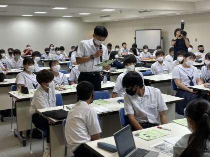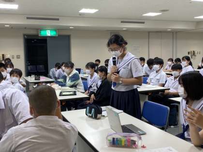 個人での意見をまとめた後、班でその意見を共有。さらにそれらを班長が全体に共有する形で、学年全体で意見を深めました。