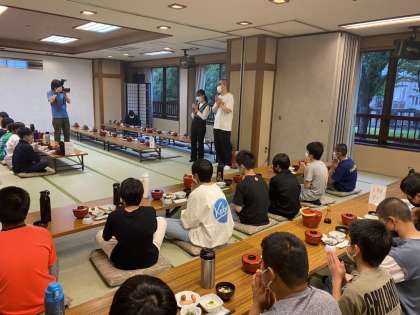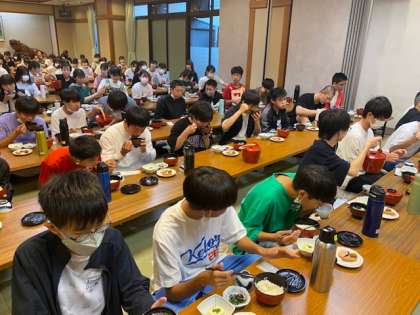 一日目はあいにくの天候でしたが、大きな事故等もなく無事終えることができました。二日目の朝も雨が降りしきっていましたが、予報では徐々に上がっていくようです。宮島でのオリエンテーリングの頃には上がっていることを期待しましょう。さて、二日目のスタートはホテルでの朝食からです。今日も一日長いですので、しっかりと食べてそれぞれの活動に積極的に取り組んでください。