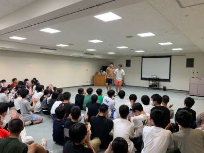 レクリエーション大会の様子です。出し物のラストは、スペシャルゲストとのことですが、どこかで見たことがある気が…。プロジェクトチームの頑張りもあり、みなさん大変盛り上がって終えることができました。