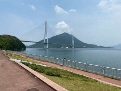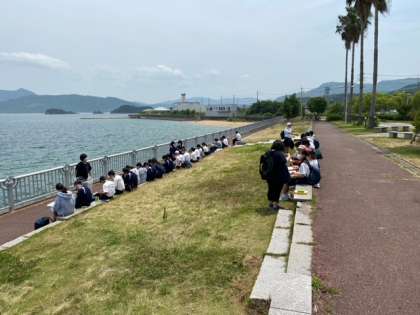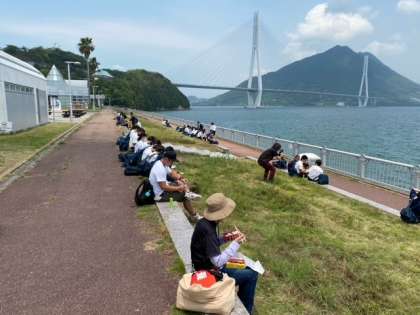 選択別体験学習を終え、見晴らしのよい場所でお弁当を食べました。三日目は天候に恵まれ、どの活動場所でも予定通り活動ができました。全体での集合写真を撮り、今回の修学旅行での全ての行程を終えました。一行は現在、多々羅しまなみ公園を出発し、バスで大阪に向かっています。