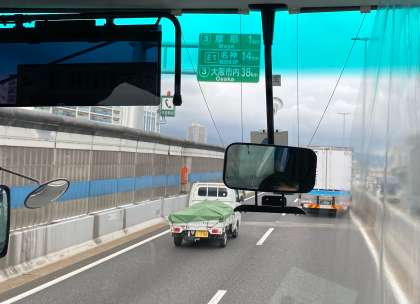 現在、バスは神戸の辺りを走行中です。道路状況を考えますと、現在のところおおむね予定時刻前後に到着する予定です。