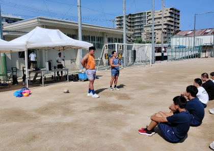 クボタスピアーズの岡田選手、山本選手を招き、ラクビースクールを開催中です。