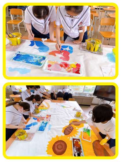 美術部では、夏のシーズンに学校玄関を彩る壁面作品を制作中です。
