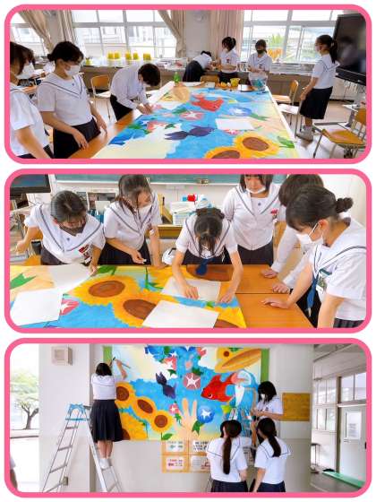 夏をテーマにした壁面作品が完成し、今年も学校玄関に展示しています。