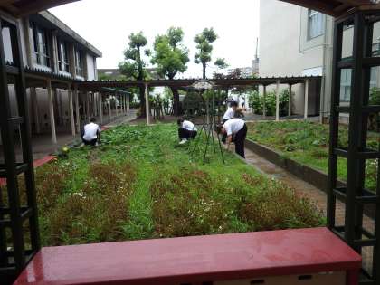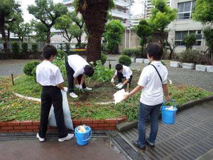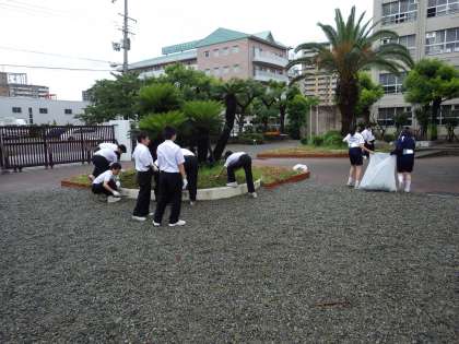 7月1日(水)雨があがった後、技術部と科学部でふれあいガーデンと正門の庭の草取りを行いました。