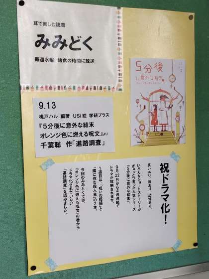 今日のみみどくで読んだのは、桃戸ハル編著『5分後に意外な結末』シリーズ(学研プラス)の『オレンジ色に燃える呪文』の巻から千葉聡作『進路調査』。