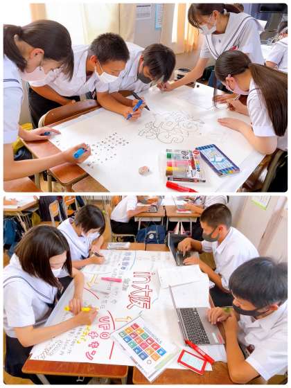 関西の日帰り旅行プランニングとその内容に関係するSDGSの取り組みを題材に、班で手分けをしながら作業を進めています。