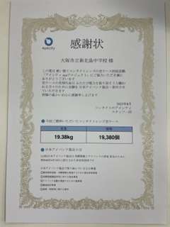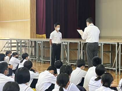 その感謝状をもらいましたので、全校集会で表彰させていただきました。