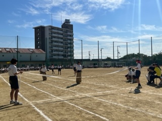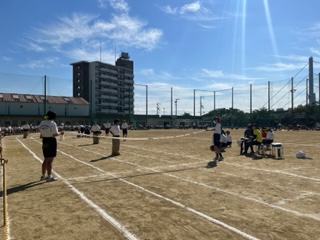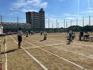 この競技は、4つの関門をクリアしながらトラックを半周します。はじめにハードルをくぐり、縄跳びを飛びながら走ります。難関のネットをくぐり、最後に麻袋に両足を入れてピョンピョン飛びながらゴールを目指します。