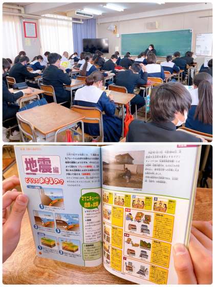 地震速報を受けて、素早く机の下にもぐって身を守り、揺れがおさまってから迅速に運動場へ避難しました。