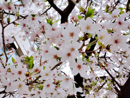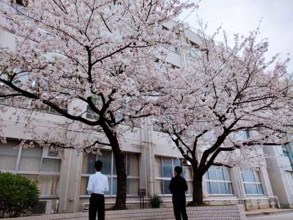 今日は中庭の桜の下で、演劇部が声出しをしていました。