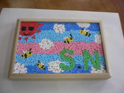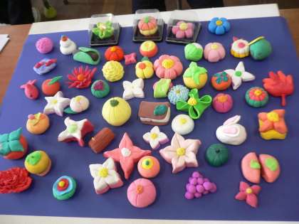 研究授業の中で作られた作品です。左の写真の和菓子は上の方にある箱に張っているものが本物で他のものは生徒作品です。