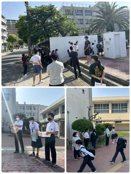 生徒会はエコキャップ回収運動、風紀委員会も元気にあいさつ運動です。