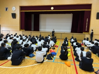 今日の学年集会では教育実習生の先生から話をしてもらいました。