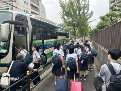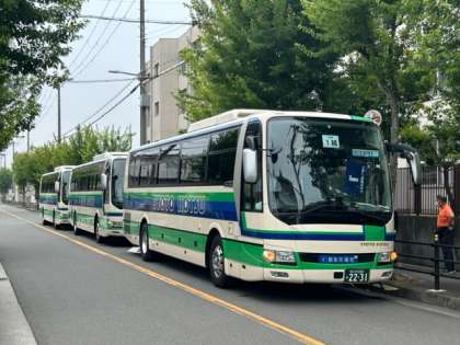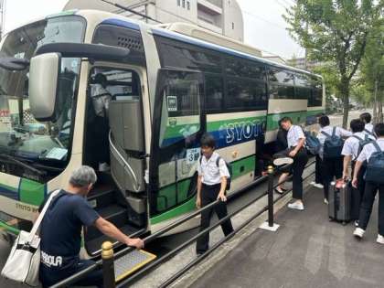 たくさんの保護者の方の送迎のもと、バスに乗車です。