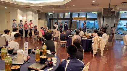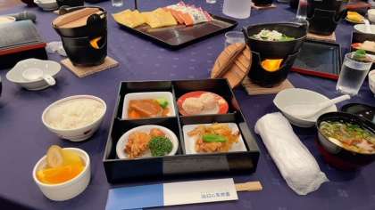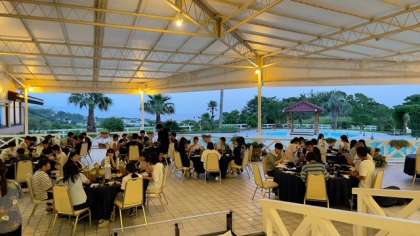 円卓を囲み、ホールやプールサイドで美味しくいただきました。
