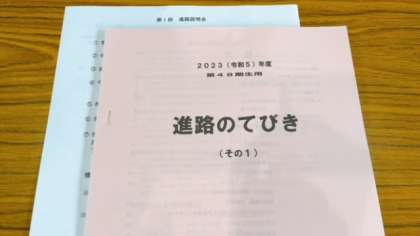 本日配布の冊子「進路のてびき(その1)」につきまして、欠席のご家庭にはお子様を通じてお渡しさせていただきますのでご一読くださいますようよろしくお願いいたします。