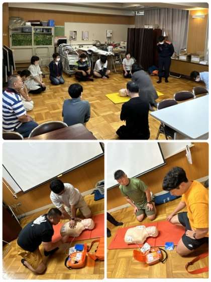 連絡から救急車が到着するまでを10分としての胸骨圧迫によるマッサージの難しさなども実践的に学びました。学ぶことの多い講習会になりました。