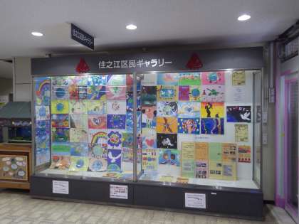 住之江区役所玄関にある区民ギャラリーに、新北島中学校の2年生の美術の作品と科学部の作品が展示されました。