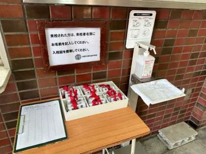 学校危機管理の向上のため、来校者受付が設置されました。保護者の方は来校時に配布しています保護者証をご持参ください。お忘れになられた場合は、受付で来校者名簿に記入していただき、首から入校証をつけてお入りください。