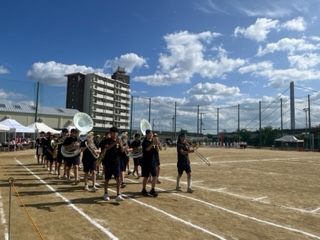 みなさんこんにちは、吹奏楽部です。私たち吹奏楽部は、聴いて楽しい、見て楽しいをモットーに日々練習に励んでいます。今回の部活動行進で演奏している曲は、ミセスグリーンアップルのダンスホールです。みなさんに元気になっていただけるような演奏をお届けします。また、文化発表会では、SNS をテーマにして、昔の曲から新しい曲までたくさん演奏します。皆さんが参加できる企画もありますので、楽しみにしていてください。本日は演奏だけでなく、走る文化部として全力でバトンをつなぎますので、応援よろしくお願いします。