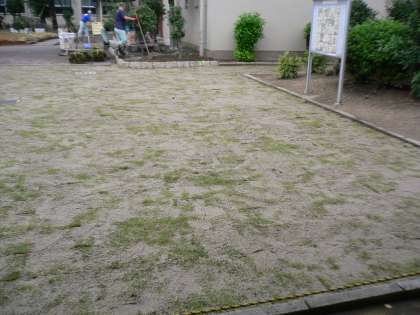 校長戦略予算による前庭の芝生化の工事が9月18日に行われました。芝生の育成のため、芝生の上から砂をかけていましたが約1か月たち芝生がずいぶん伸びてきました。