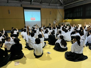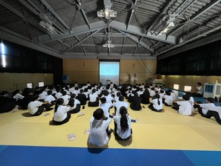 ?5・6時間目に体育ホールで住之江区役所の方に来ていただき、防災についての講話を聞きました。