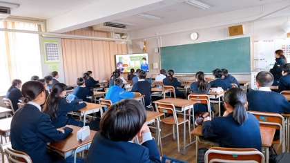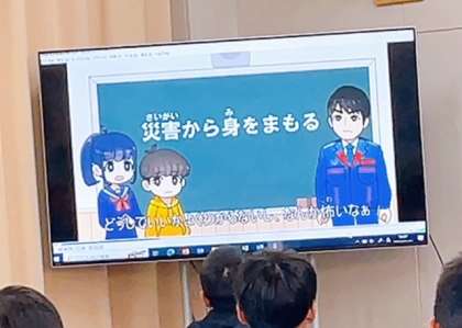 運動場から校舎最上階に避難する訓練の後、クラスに戻り地震・津波に関する動画を視聴しました。