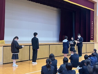全校集会で吹奏楽部の表彰がありました。
