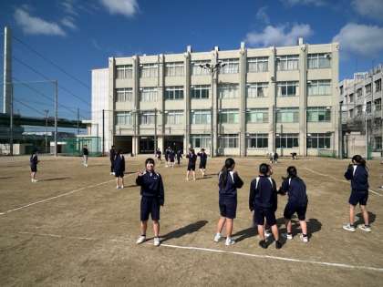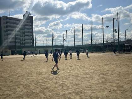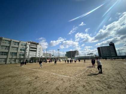 グラウンドでは体育の授業でドッチボールとサッカーをしています。