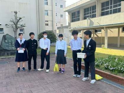 正門で元気よく挨拶をしています!元気な挨拶には元気な挨拶で返しましょう!ペットボトルキャップ、コンタクトレンズケースの回収もしています!