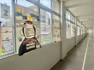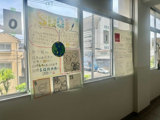 SDGsの取り組みで作成したパネルを廊下に展示しています。
