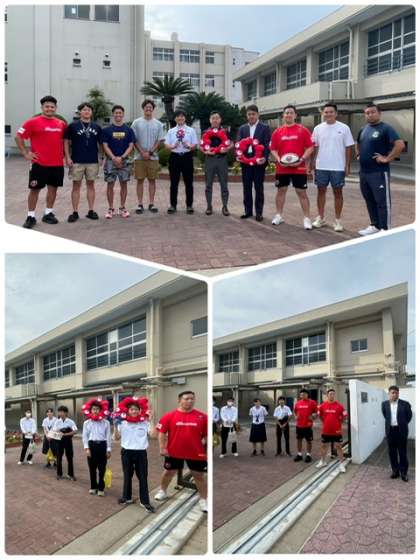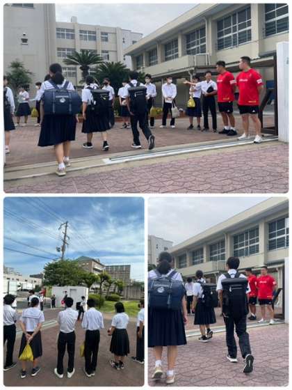 今日は朝のあいさつ運動に住之江区の藤井区長、ラグビー大阪レッドハリケーンズの安田 司選手、大塚 健太郎選手があいさつ運動に参加してくれました。生徒会も一緒に活動し、朝から明るく元気に登校できました。ありがとうございました。