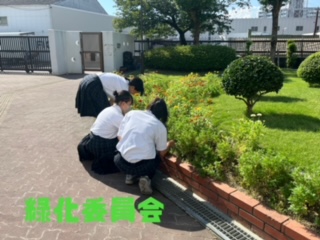 緑化委員会では目標と具体的方策を決めた後、正門前の花壇の草むしりを行いました。