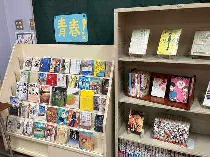 図書室では、みみどくにあわせて「青春!な本」を展示しています。