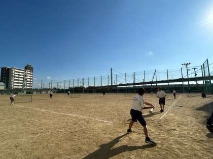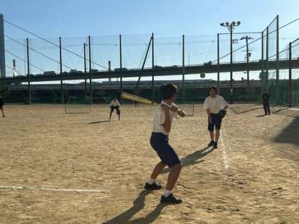 体育はグラウンドで野球のようなゲームで対戦しています。楽しそうですね。