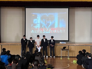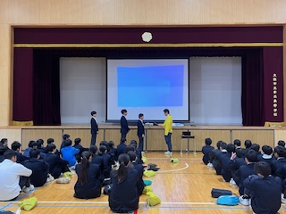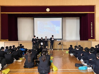 今日の集会では、先日行われた高校調査の各クラスの代表班によるプレゼンがありました。