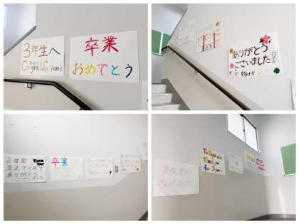 3年生の教室へ向かう廊下には、1.2年生からの卒業メッセージが飾られています。